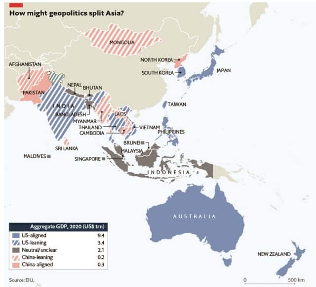 The Quad remains a non-military alliance, but the size of economies and composition and strength of the militaries of the members is huge. In the region, China has two countries, Pakistan and North Korea that can be called as allies (Figure Below). There are other countries like Mongolia, Myanmar, Cambodia, Sri Lanka, and Laos, that can be called China leaning. China is also trying to befriend Pacific Island nations. The countries aligned with the US, include Japan, South Korea, Philippines, Australia, and New Zealand. AUKUS has brought UK in the area. France has old colonial connections. Many countries like India, Thailand, and Vietnam are America leaning when it comes to China. After recent Taiwan incidents, the world has got more galvanised. By doing Galwan, China antagonised 1.3 billion Indians.